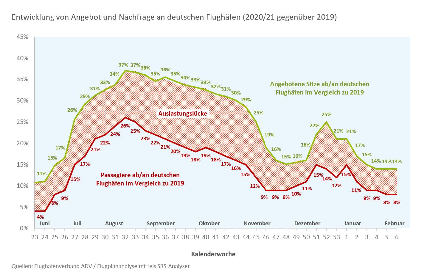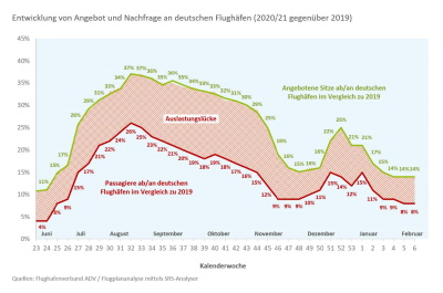Aktuell verzeichnet die Luftverkehrswirtschaft – gemessen am Vorkrisenjahr 2019 – gerade einmal 8 Prozent der Passagierzahlen an den deutschen Flughäfen. Dementsprechend hat sich auch das Flugangebot weiter reduziert und lag im Februar bei rund 14 Prozent des Vorkrisenniveaus. Nach diesen jetzt vom Bundesverband der Deutschen Luftverkehrswirtschaft (BDL) vorgelegten aktuellen Zahlen hat der deutsche Luftverkehr Mitte Februar einen neuen Tiefpunkt erreicht, und es ist nicht abzusehen, wann die Talsohle durchschritten ist.